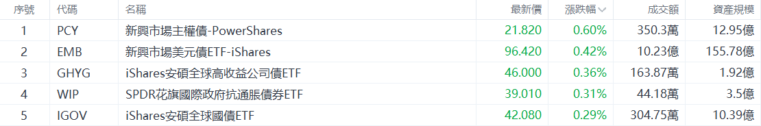 $新兴市场主权债-PowerShares (PCY.US)$ 升0.60%,成交额350.3万美元。