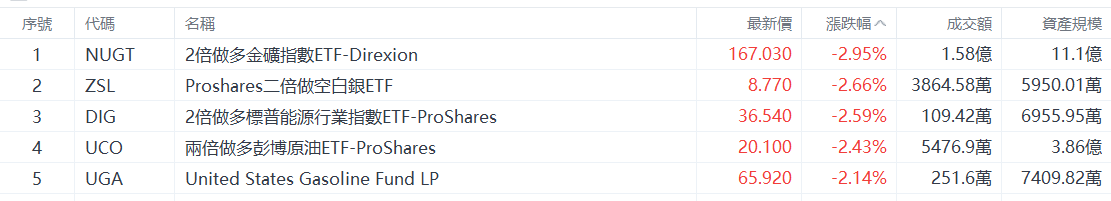 $2倍做空能源ETF-Direxion (ERY.US)$ 升2.51%,成交额335.6万美元。