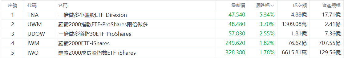 $三倍做多小盘股ETF-Direxion (TNA.US)$ 升5.34%,成交额4.88亿美元。