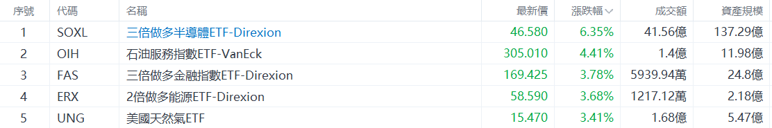 $2倍做多能源ETF-Direxion (ERX.US)$ 升3.68%,成交额1217.12万美元。