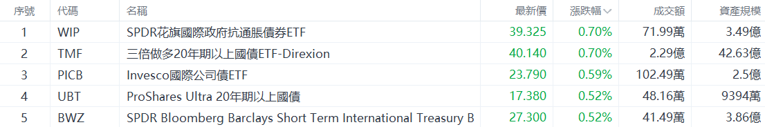 $三倍做多20年期以上国债ETF-Direxion (TMF.US)$ 升0.70%,成交额2.29亿美元。
