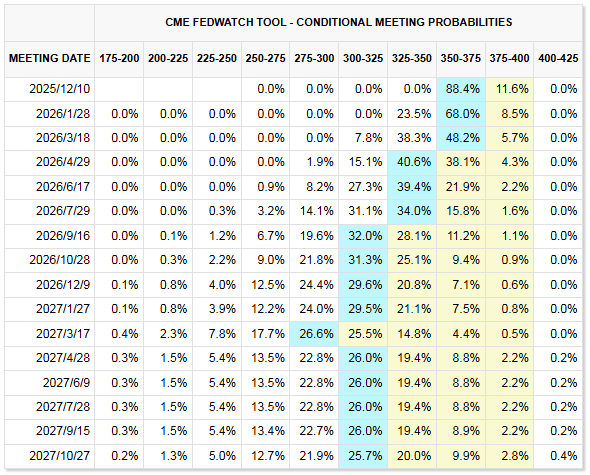 美联储自2024年9月开始将联邦基金利率从二十多年高位下调,迄今已累计降息150个基点,使其处于3.75%-4%。交易员已完全定价美联储将在本周三再次降息25个基点,并普遍预计明年还将有两次各25个基点的降息,使该基准利率降至3.00%-3.25%。