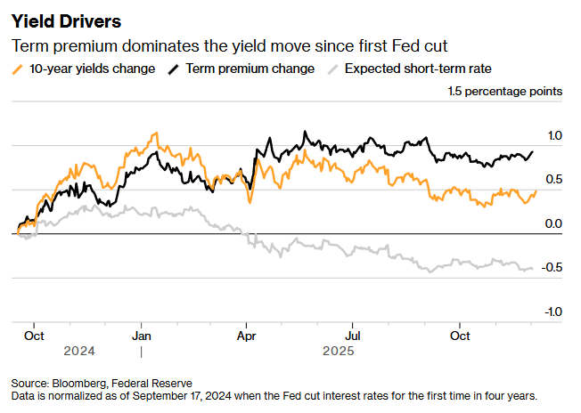 自美联储本周周期首次降息以来,期限溢价主导了收益率变动