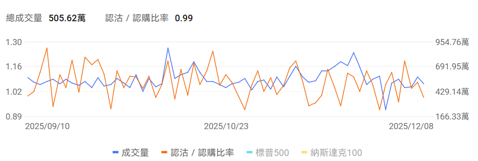 当前美股指数期权市场成交量下行,认沽/认购比例下行。