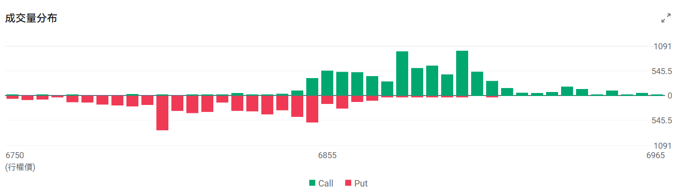 今日到期的 $标普500指数 (.SPX.US)$ 期权成交量分布:Call单与Put单分布存在分歧,Put单峰值在6800点,Call单峰值在6900点。