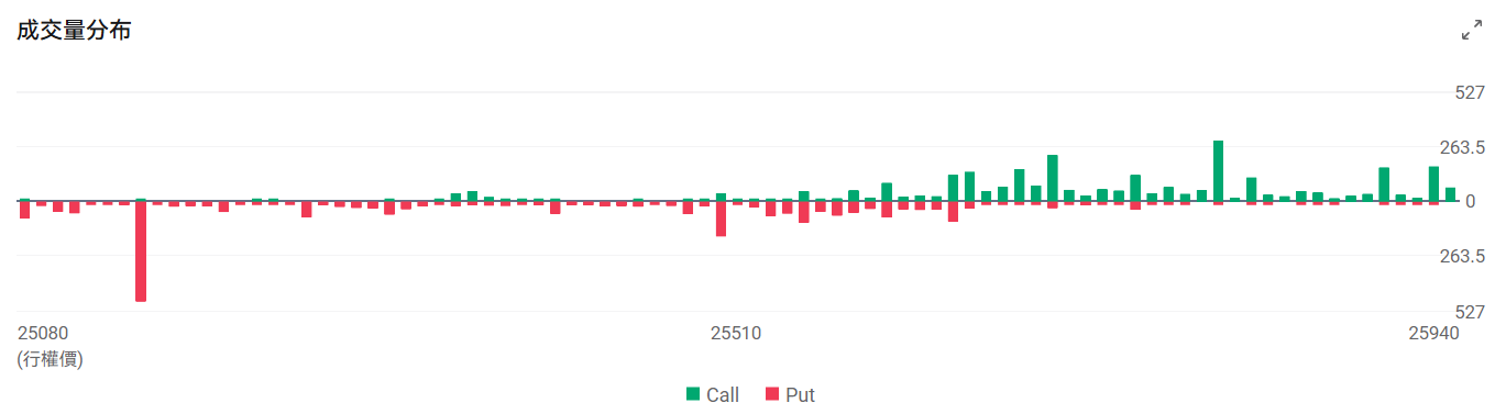 今日到期的 $纳斯达克100指数 (.NDX.US)$ 期权成交量分布:Call单峰值为25800,Put单峰值在25150点。