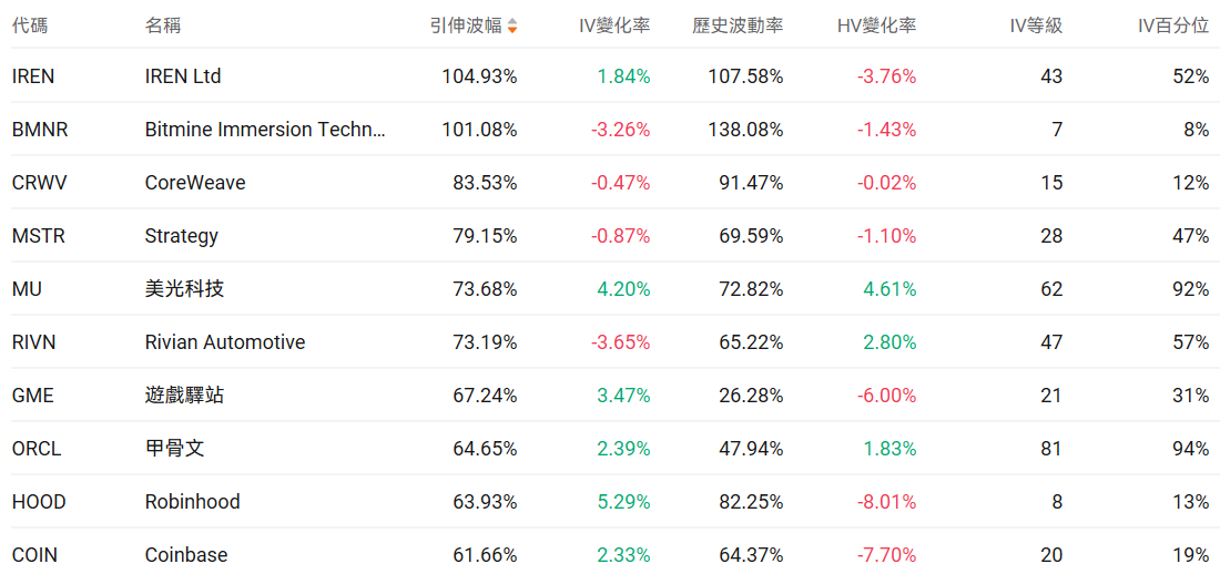 美股期权波动率排行榜前十(标的市值>100亿美元,且期权成交量>10万张)