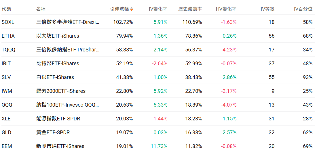 美股ETF引申波幅排行榜前十(标的要求:市值>100亿美元)