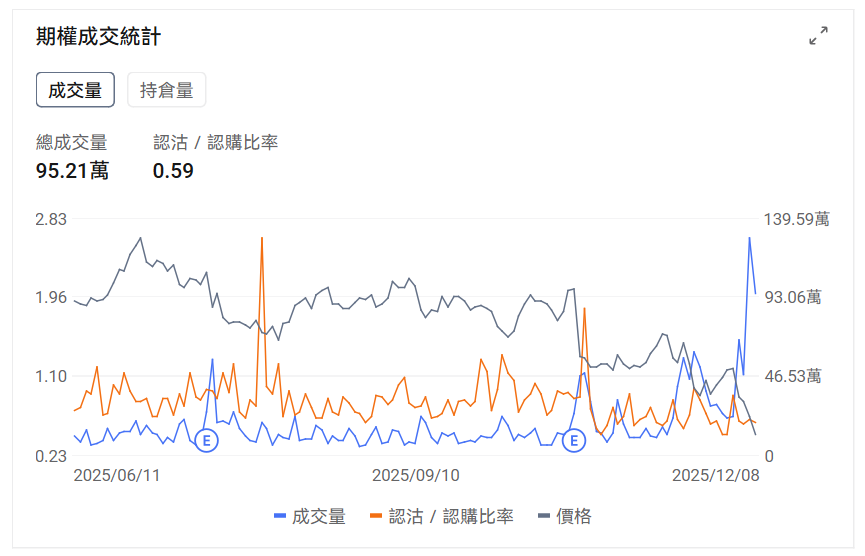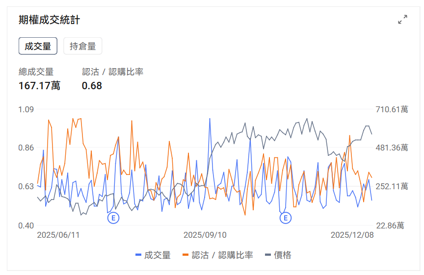 2、 $特斯拉 (TSLA.US)$ 上一交易日跌3.39%,前一日认沽/认购比例略有下行,成交量下行。