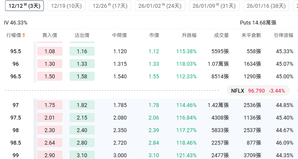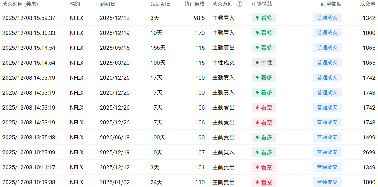 1、 $奈飞 (NFLX.US)$ 上一交易日跌3.44%,前一日认沽/认购比例略有下行,成交量下行。
