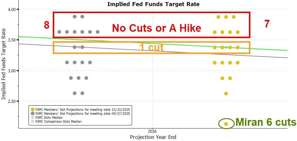 点阵图显示,此次有六人预计今年末利率在3.75%到4.0%,占提供预测总人数的30%以上。这相当于,共六人认为本次会议应保持利率不变,其中包括有FOMC会议投票权的两名投反对票票委,以及四名没有此次会议投票权的联储官员。加上力主更大幅降息的理事米兰在内,反对本次会议降息25基点的总人数就达到七人。