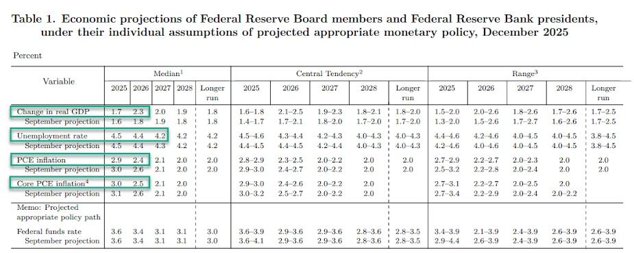 2025年PCE通胀率预期为2.9%,9月预期3.0%,2026年预期为2.4%,9月预期2.6%,2027年增速预期为2.1%,2028年和更长期的预期均为2.0%,均持平9月预期。