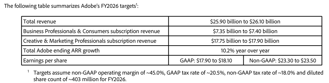 Adobe周三表示,预计截至2026年11月的2026财年营收将达到259亿至261亿美元。尽管这一预测区间中值超过了华尔街分析师的平均预期,但不及部分分析师预期的超过264亿美元。该公司还预计,2026财年调整后每股收益为23.30美元至23.50美元,该预测区间中值略高于华尔街分析师平均预期的23.37美元。