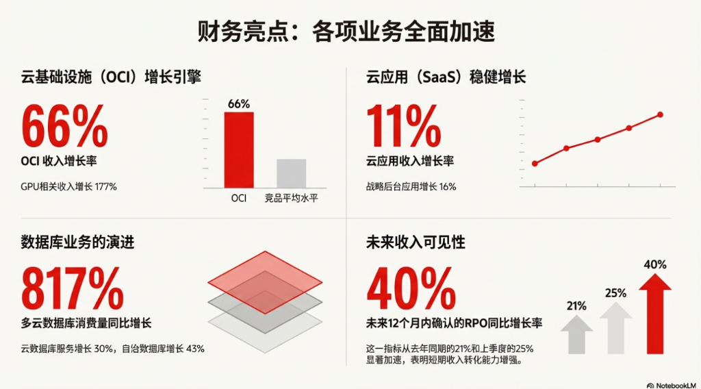 基础设施(OCI)增速碾压对手:IaaS收入增长66%,GPU相关收入暴增177%,并交付了9.6万颗NVIDIA GB200芯片。