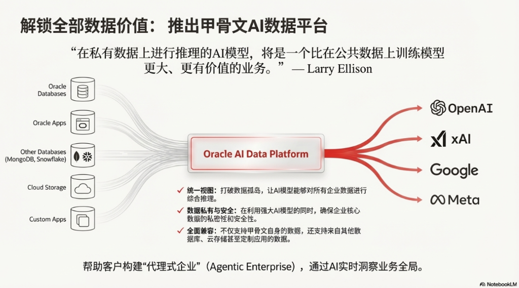 Larry Ellison的AI终局构想:埃里森认为AI的未来在于“对私有数据进行多步推理”,并称甲骨文的AI数据平台能让大模型连接所有数据库(包括非甲骨文数据),这是打破数据孤岛的关键。