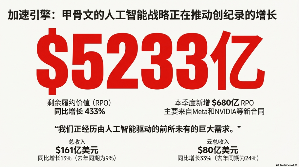 积压订单(RPO)爆炸式增长:RPO达到惊人的5233亿美元,同比增长433%,主要由Meta、NVIDIA等巨头的算力合同驱动。