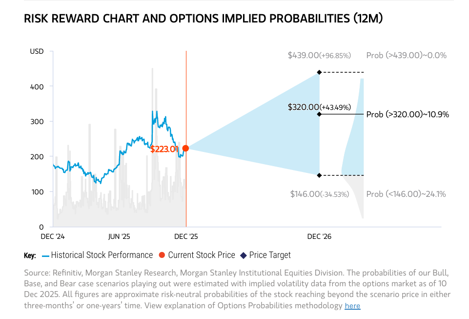 瑞银维持“买入”评级,但将目标价从380美元下调至325美元,估值基础从2027财年44倍PE降至37倍,理由是短期业绩不及预期与融资前景的不确定性。美银同样保留“买入”评级,目标价从368美元下调至300美元,估值锚从12.4倍2027财年EV/销售额,调整为10倍,契合当前AI板块整体估值收缩的趋势。