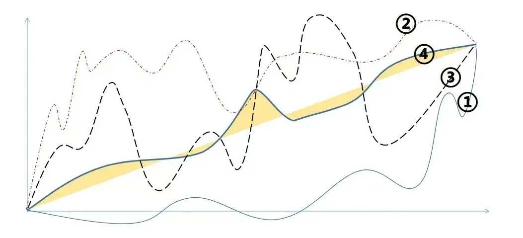 这个问题类似下面的图,我在以前的多篇文章中引用过,几支股票的收益率完全相同,但在那些波动更小的股票上,普通投资者更容易赚到钱。