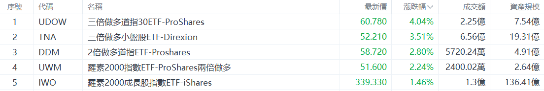 美股大型指数ETF升幅榜Top5