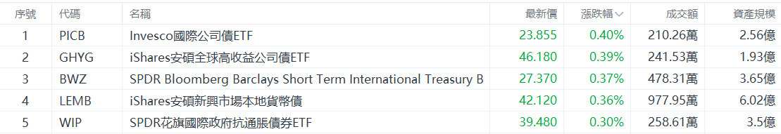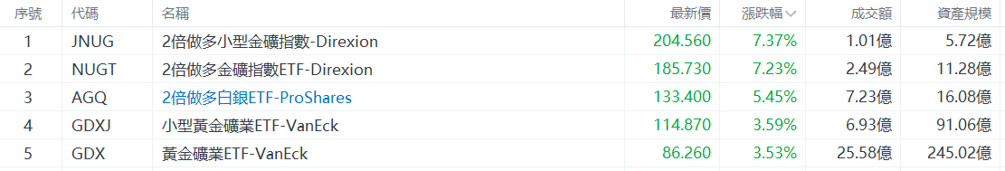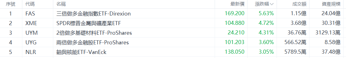 美股ETF升幅榜Top5