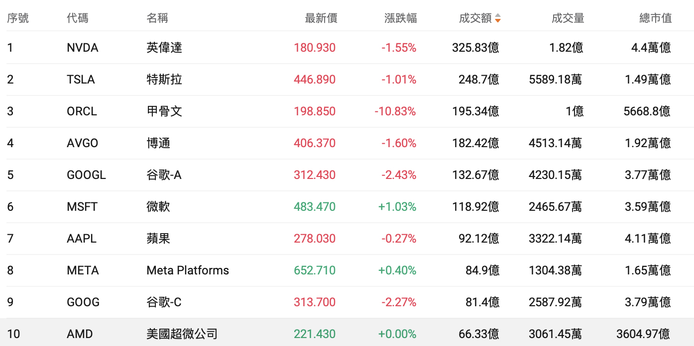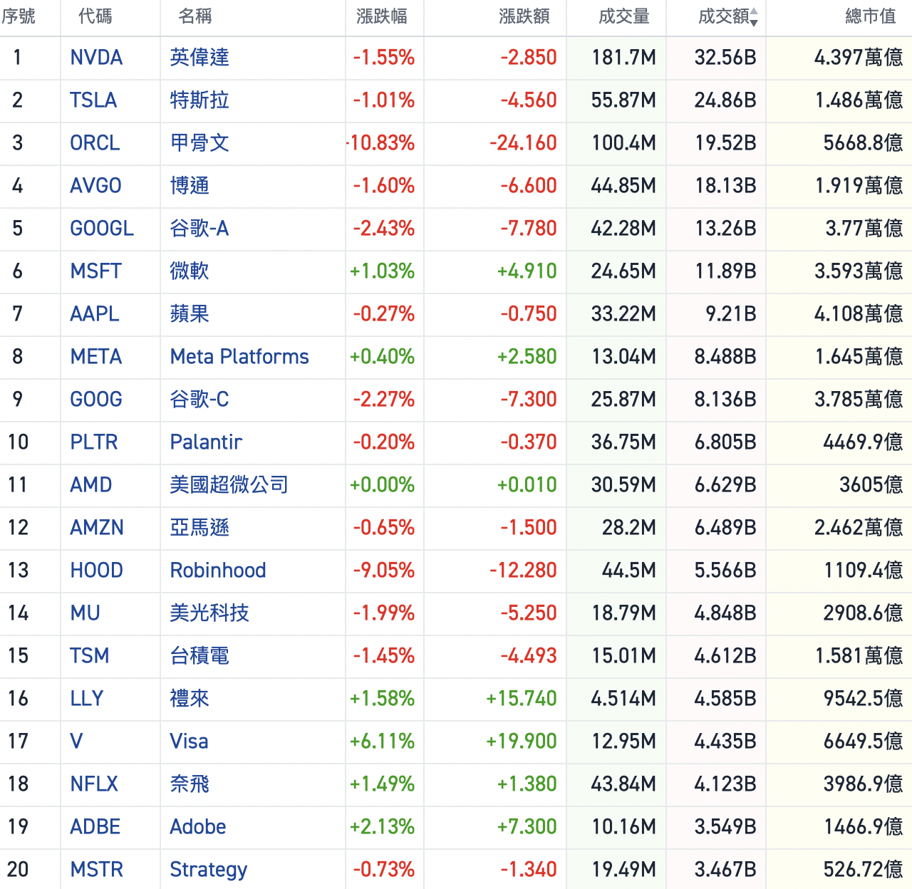 $明星科技股(LIST2518.US)$ 多数下跌, $甲骨文(ORCL.US)$ 跌超10%, $谷歌-C(GOOG.US)$ 跌超2%, $特斯拉(TSLA.US)$ 、 $英伟达(NVDA.US)$ 跌超1%。