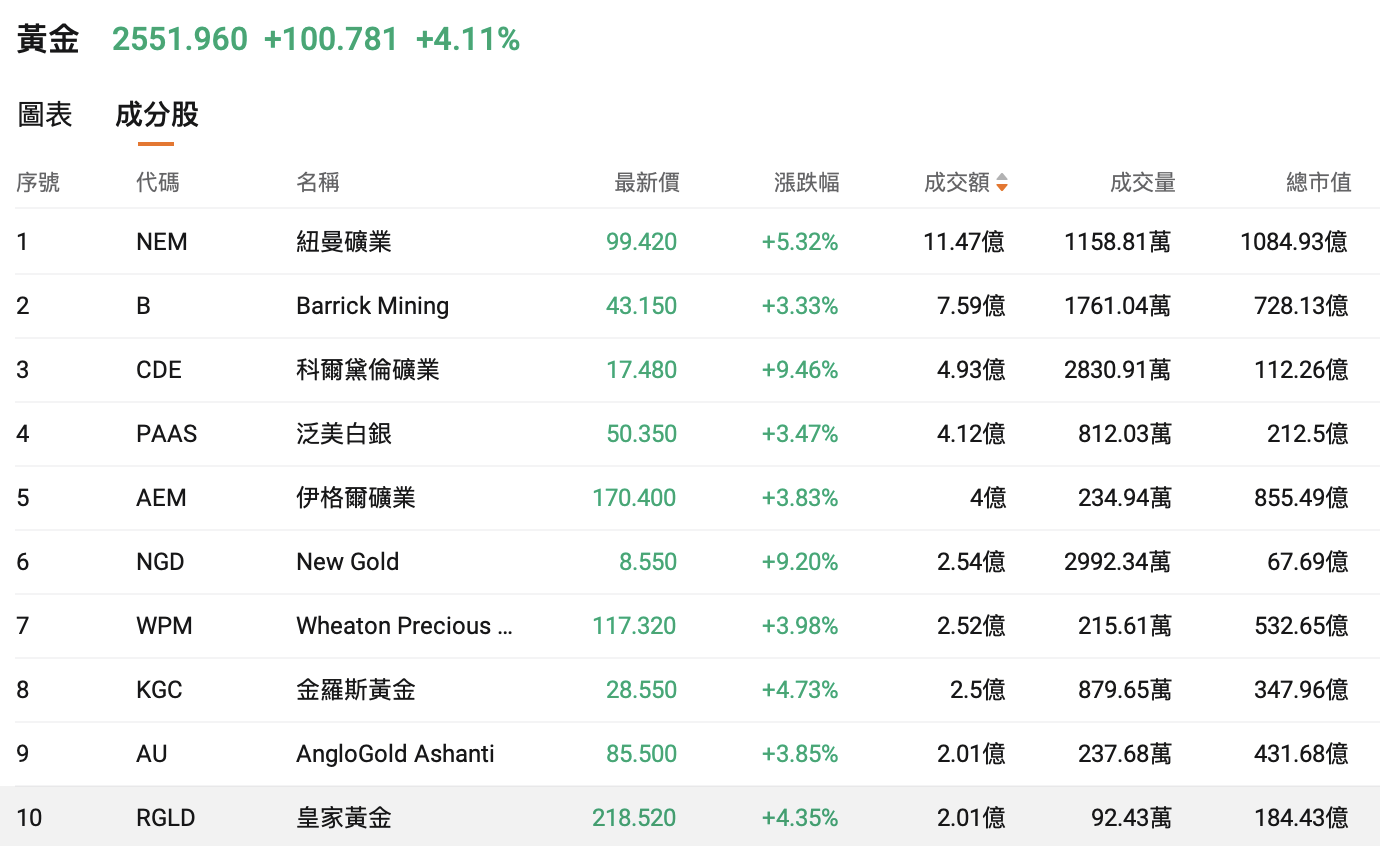 $黄金(LIST2110.US)$ 概念股普涨, $科尔黛伦矿业(CDE.US)$ 涨超9%, $纽曼矿业(NEM.US)$ 涨超5%。