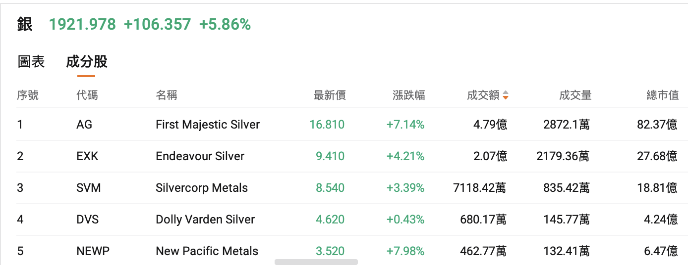 $银(LIST2093.US)$ 概念股继续走高, $First Majestic Silver(AG.US)$ 、 $New Pacific Metals(NEWP.US)$ 涨超7%。