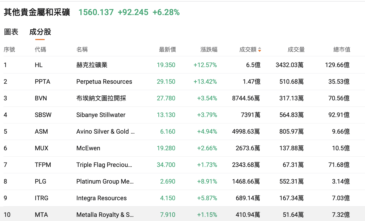 $其他贵金属和采矿(LIST2507.US)$ 股普涨, $赫克拉矿业(HL.US)$ 涨超12%, $Perpetua Resources(PPTA.US)$ 涨超13%。