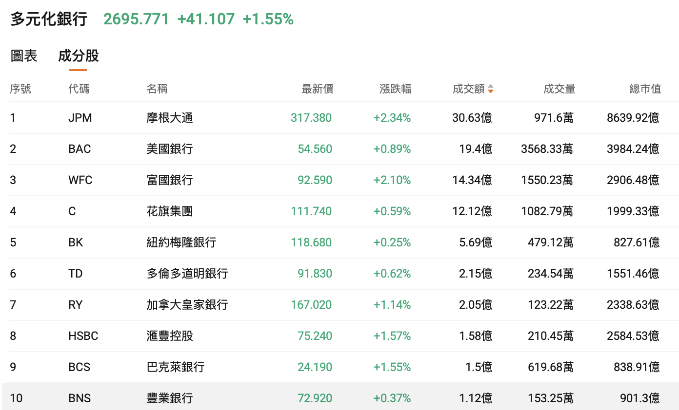 $多元化银行(LIST2481.US)$ 普涨。 $摩根大通(JPM.US)$ 、 $富国银行(WFC.US)$ 涨超2%。