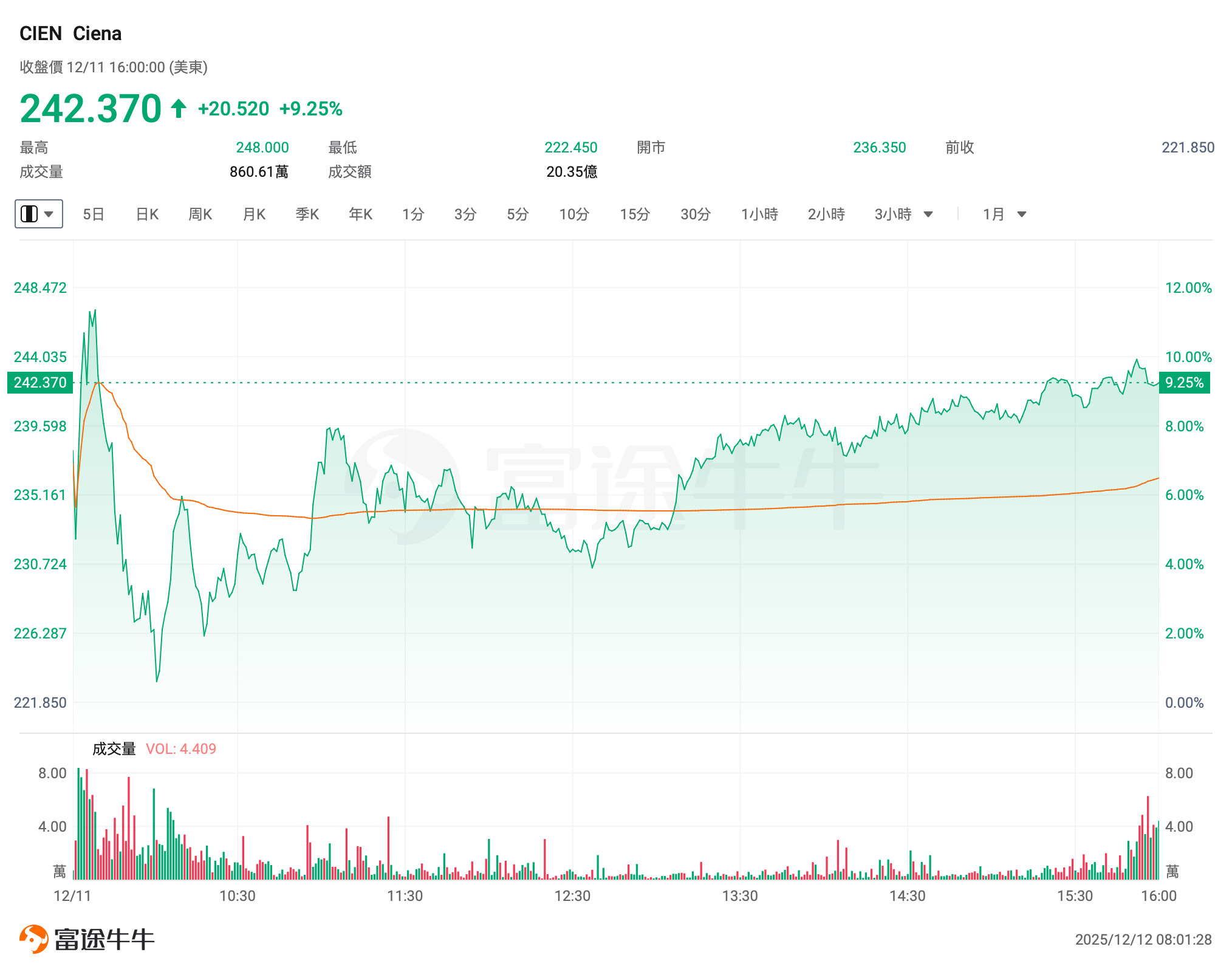 Ciena第四财季业绩超预期,云计算和人工智能需求强劲,涨超9%