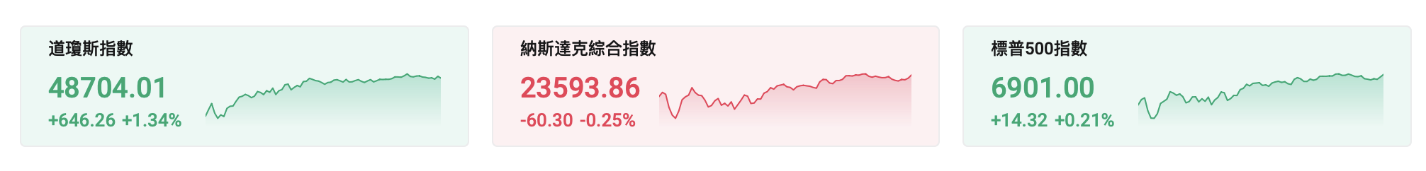 三大指数涨跌不一,截止收盘,$道琼斯指数(.DJI.US)$涨1.34%,$纳斯达克综合指数(.IXIC.US)$跌0.25%,$标普500指数(.SPX.US)$涨0.21%。