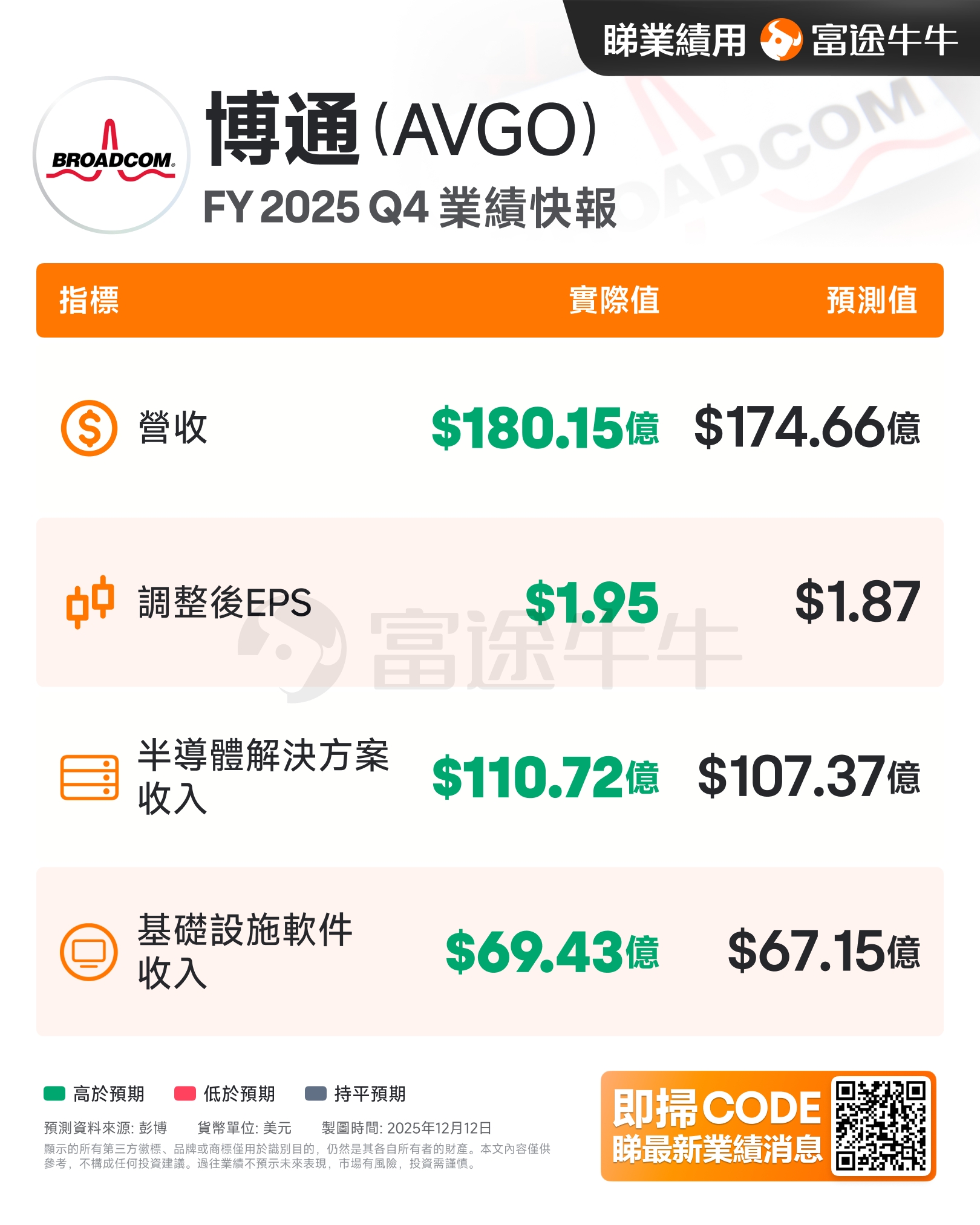 美东时间周四盘后,博通公司发布了2025财年第四季度财报。财报显示,在旺盛的AI需求下,公司每股盈利达1.95美元,超出分析师预期的1.87美元;营收为180.2亿美元,同样高于预期的174.6亿美元。