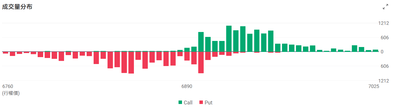 今日到期的 $标普500指数 (.SPX.US)$ 期权成交量分布:Call单与Put单分布存在分歧,Put单峰值在6850点,Call单峰值在6920点。