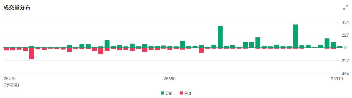 今日到期的 $纳斯达克100指数 (.NDX.US)$ 期权成交量分布:Call单峰值为25850,Put单峰值在25500点。