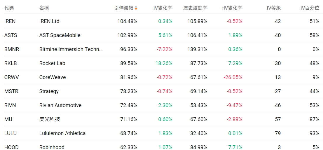 美股期权波动率排行榜前十(标的市值>100亿美元,且期权成交量>10万张)