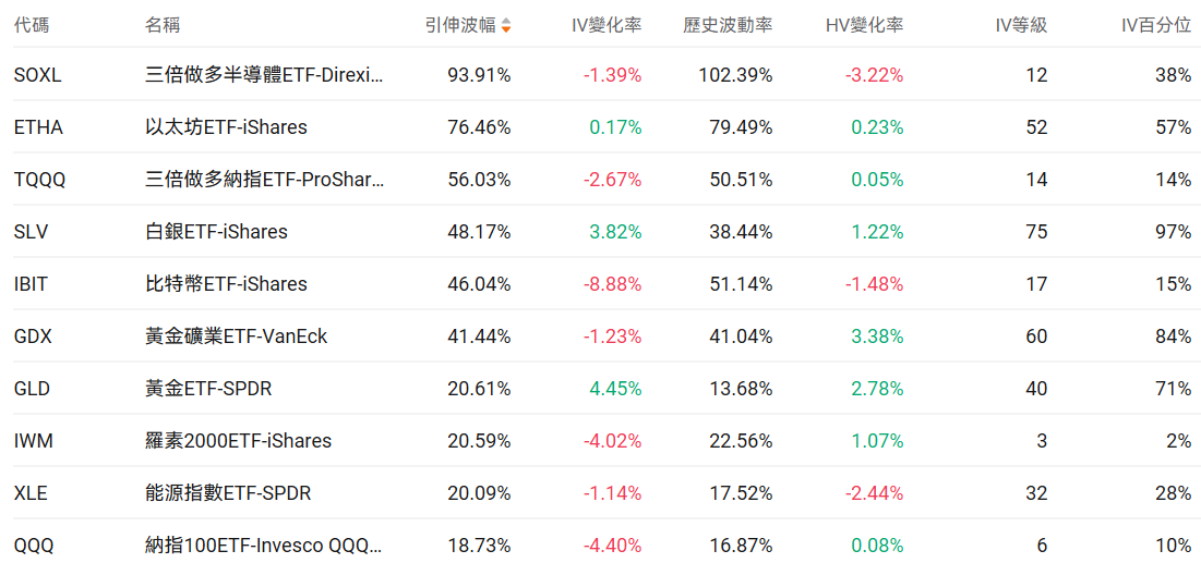 美股ETF引申波幅排行榜前十(标的要求:市值>100亿美元)