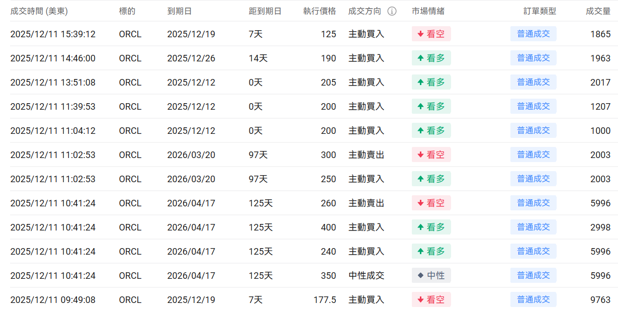 1、 $甲骨文 (ORCL.US)$ 上一交易日跌10.83%,前一日认沽/认购比例上行,成交量大幅度上行。
