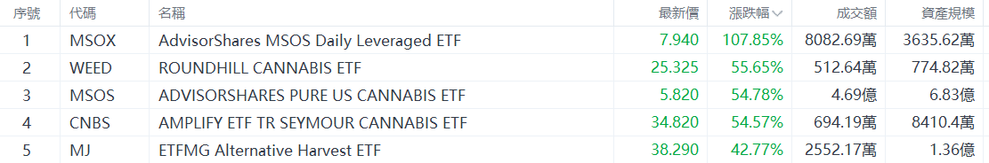 $ROUNDHILL CANNABIS ETF(WEED.US)$ 升55.65%,成交额512.64万美元。
