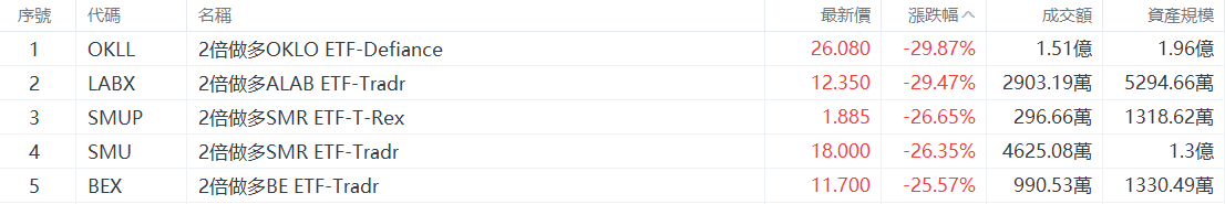 $2倍做多OKLO ETF-Defiance(OKLL.US)$ 跌29.87%,成交额1.51亿美元。