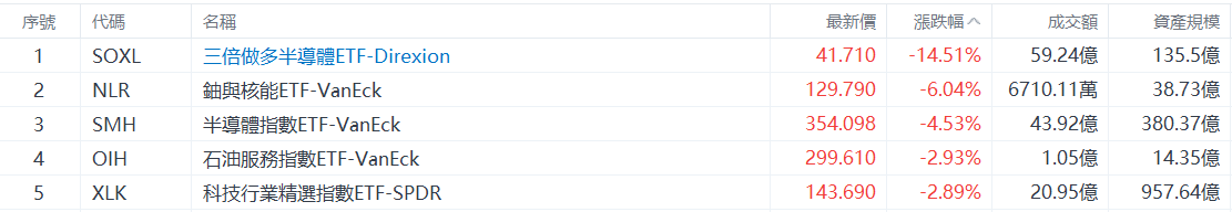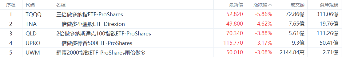 $三倍做多纳指ETF-ProShares(TQQQ.US)$ 跌5.86%,成交额72.86亿美元。