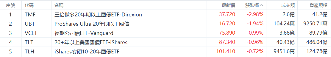 $三倍做多20年期以上国债ETF-Direxion(TMF.US)$ 跌2.98%,成交额2.6亿美元。