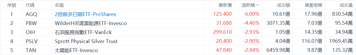 $2倍做多白银ETF-ProShares(AGQ.US)$ 跌6.00%,成交额10.61亿美元。