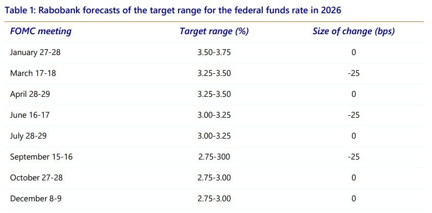 荷兰合作银行认为由于中期选举的政治压力以及美联储人事格局的变动,美联储在2026年的降息幅度或将超出市场预期。