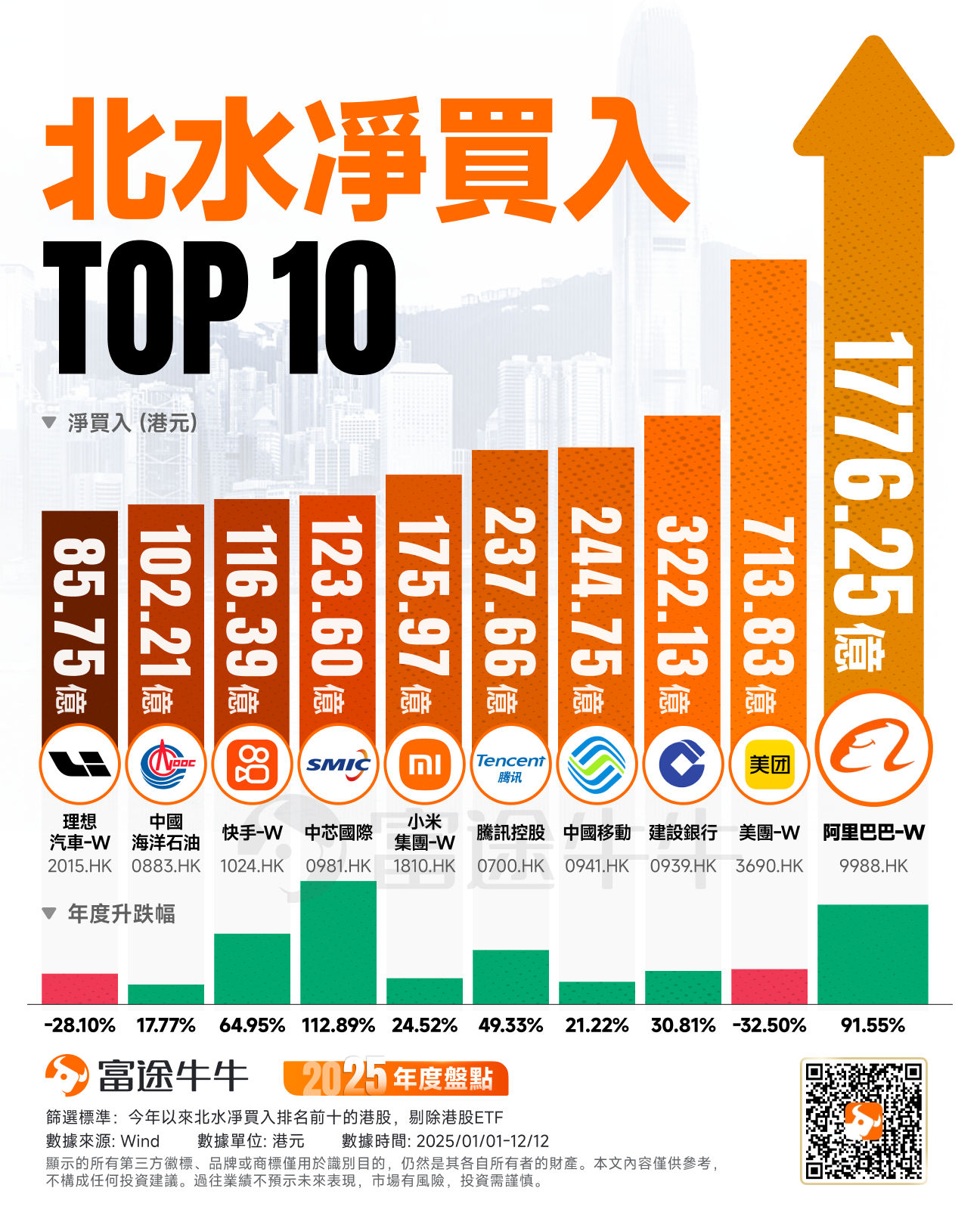 从南向资金全年流向来看,金融、非必需性消费、科技股等是北水最青睐的标的。$阿里巴巴-W (09988.HK)$于今年开始执行AI基础设施扩张计划,从Qwen3-Max到千问App,9月季度的资本开支同比暴增80%,达到320亿人民币。今年仍位列南向资金净流入榜首,截至12月12日,北水今年抢筹阿里超1776亿港元,超过去年全年的817亿港元。