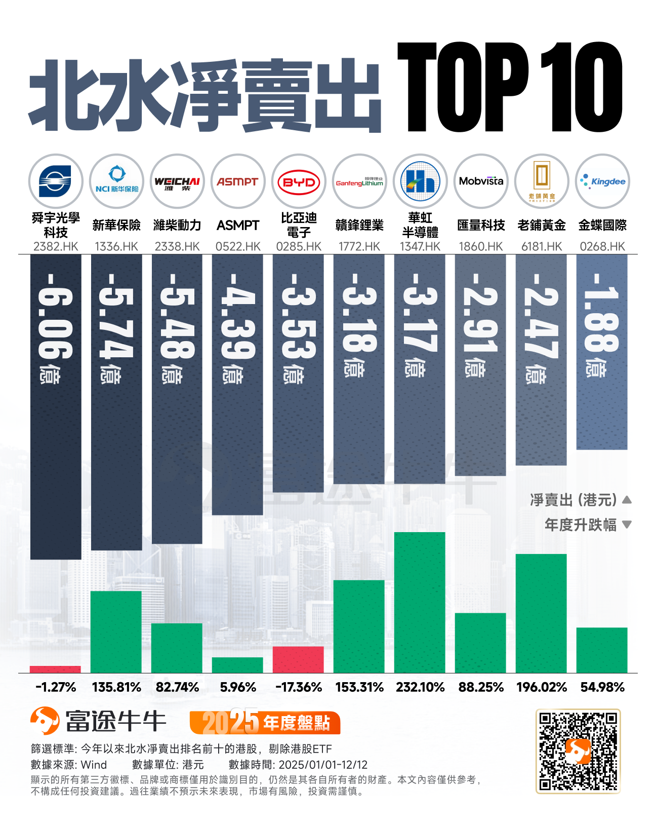 净卖出方面,舜宇光学科技和新华保险被资金抛售居前,其中$舜宇光学科技 (02382.HK)$以6.06亿港元位列卖出榜榜首,不过年跌幅不明显,反而第2位的$新华保险 (01336.HK)$年涨幅近136%。3-5名的$潍柴动力 (02338.HK)$、$ASMPT (00522.HK)$、$比亚迪电子 (00285.HK)$、$李宁 (02331.HK)$分别被卖出5.48亿港元、4.39亿港元、3.53亿港元。$赣锋锂业 (01772.HK)$、$老铺黄金 (06181.HK)$虽然也在净卖出榜单中,但年度分别累涨超153%和196%,表现亮眼。