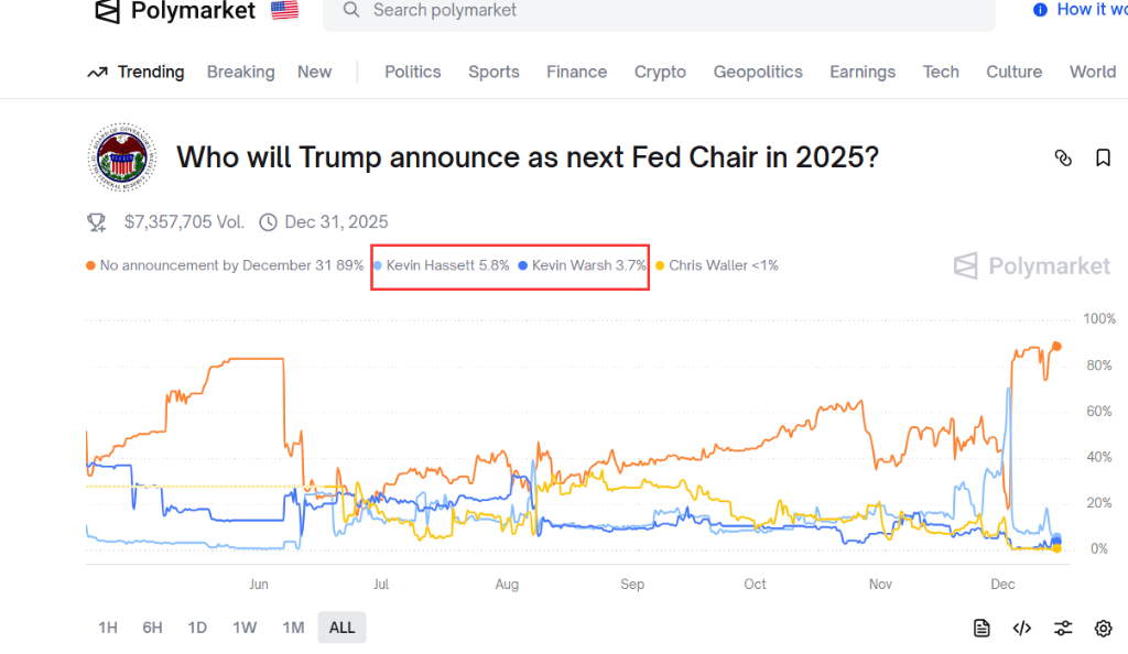 这表明,尽管沃什的胜算显著提高,但哈塞特的领先地位目前还算稳固。