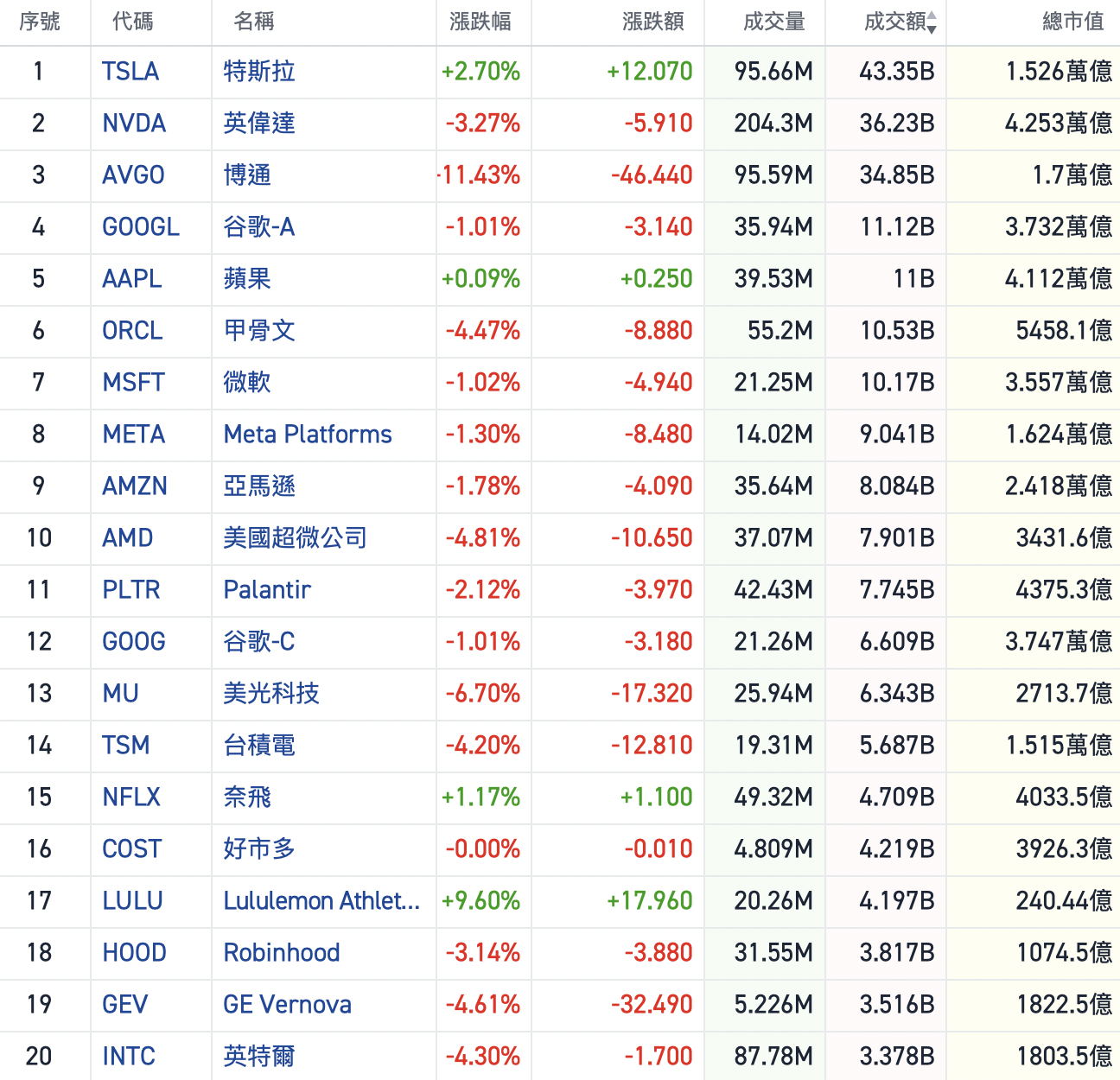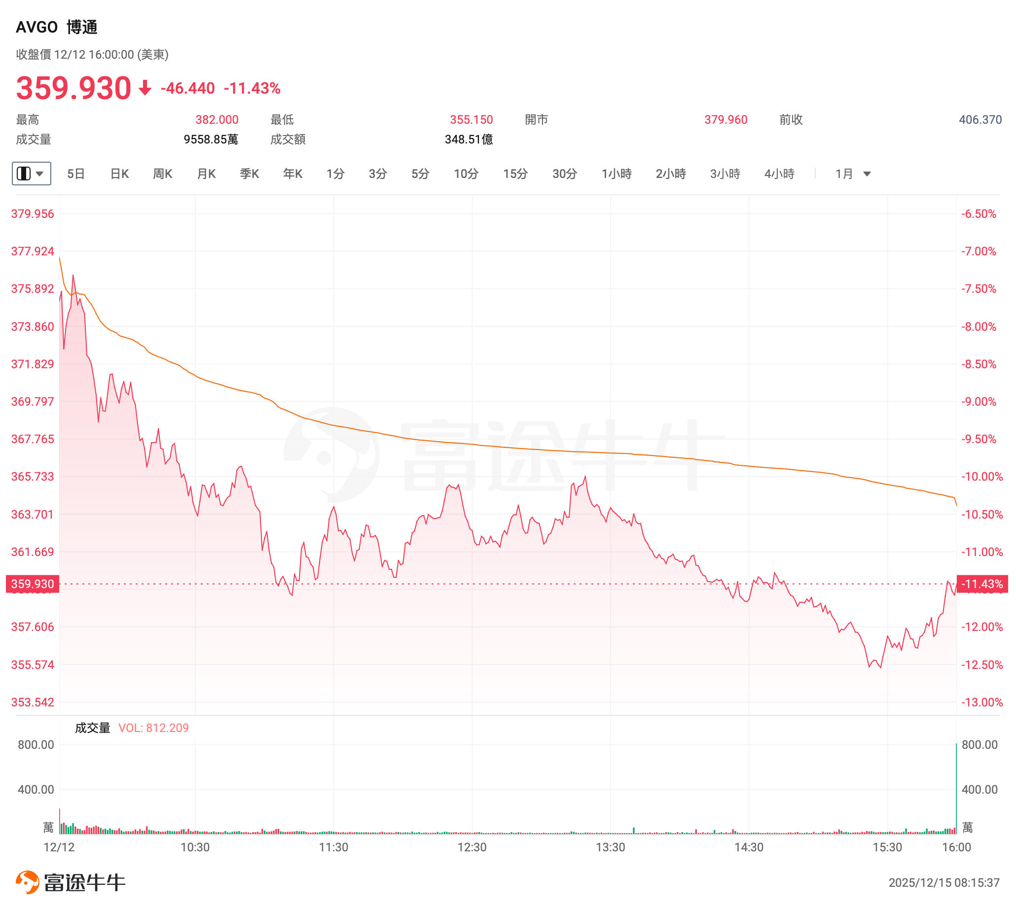 $明星科技股(LIST2518.US)$ 普跌, $博通(AVGO.US)$ 跌超 11%, $英伟达(NVDA.US)$ 跌超 3%, $谷歌-C(GOOG.US)$ 、 $微软(MSFT.US)$ 、 $Meta Platforms(META.US)$ 、 $亚马逊(AMZN.US)$ 均跌超 1%。