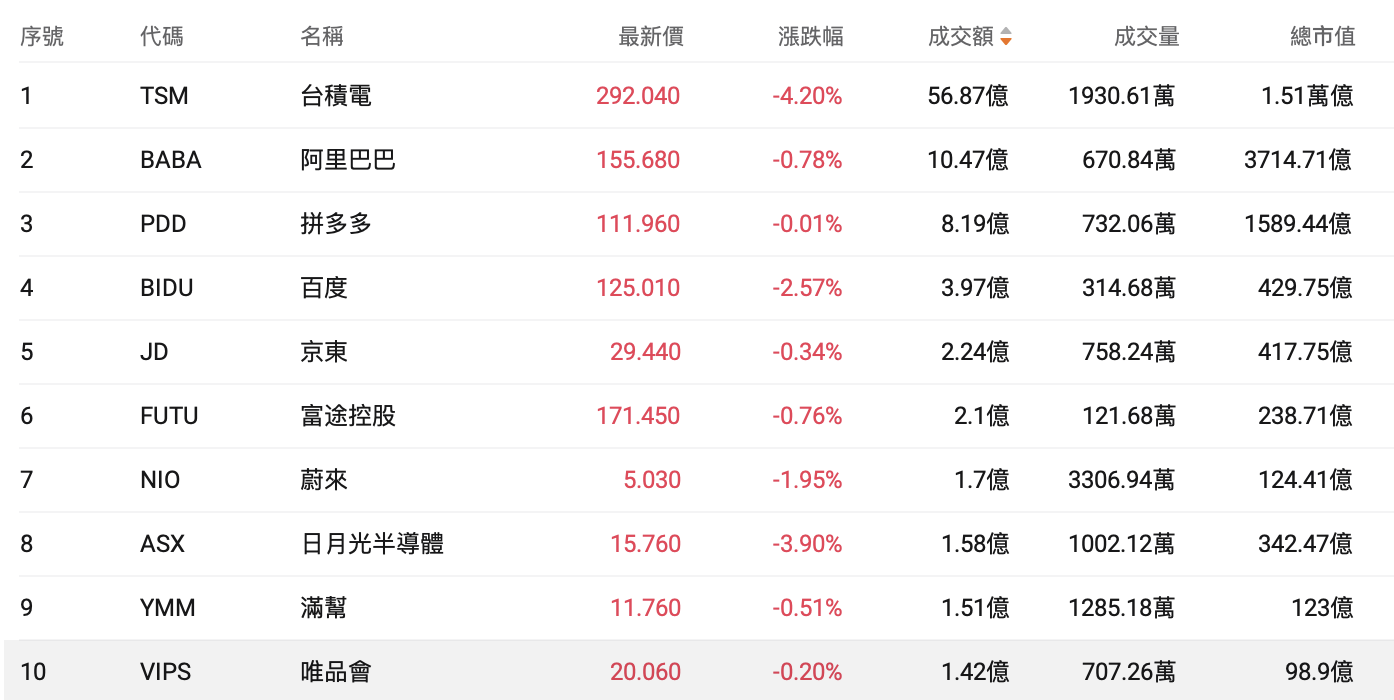 $热门中概股(LIST2517.US)$ 多数下跌, $台积电(TSM.US)$ 跌超4%, $日月光半导体(ASX.US)$ 跌近4%, $百度(BIDU.US)$ 跌超2%。