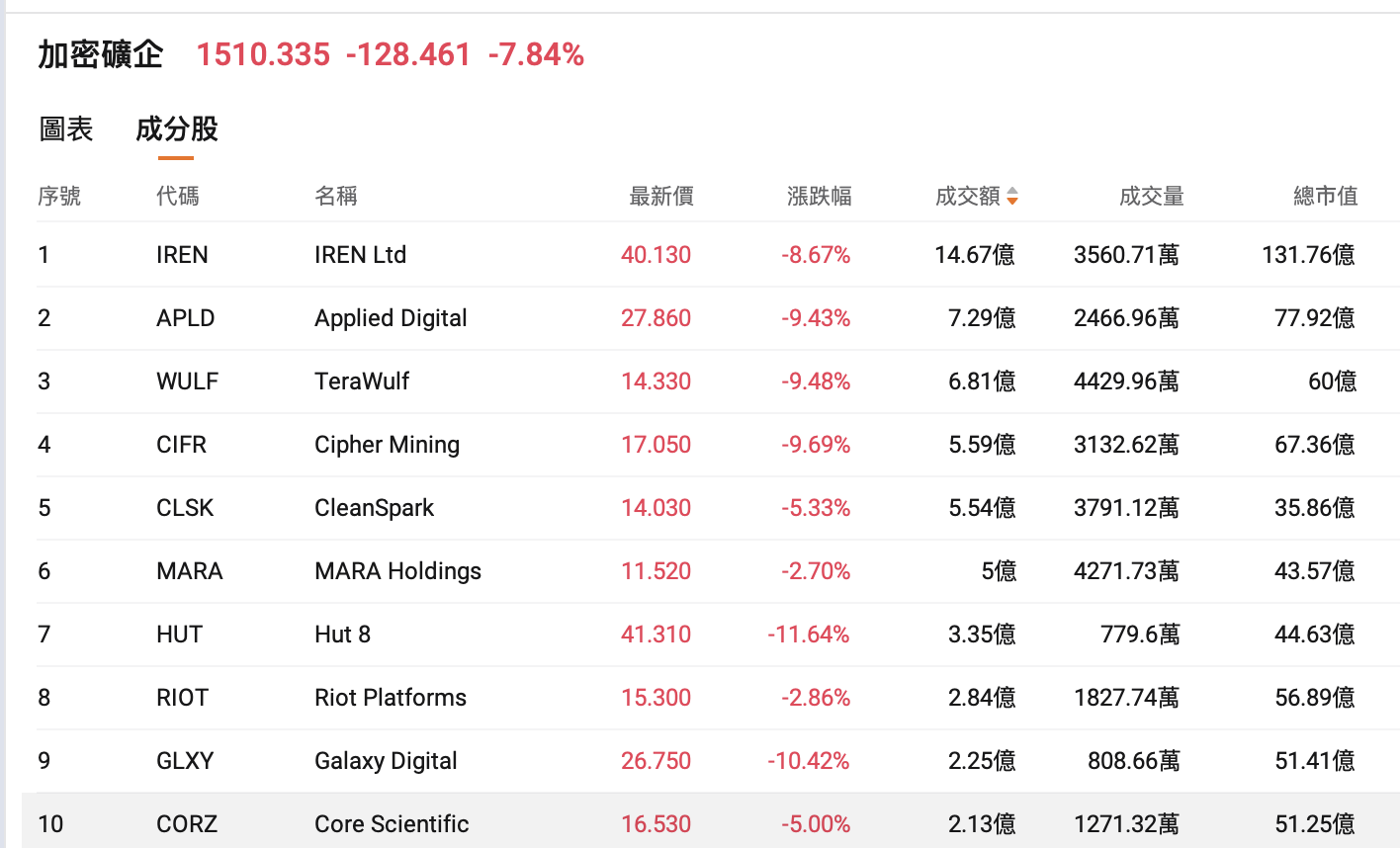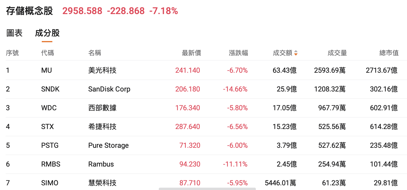 $存储概念股(LIST23925.US)$ 、 $核电(LIST2583.US)$ 、 $加密矿企(LIST23921.US)$ 、 $半导体(LIST2015.US)$ 跌幅居前, $SanDisk Corp(SNDK.US)$跌近15%; $Oklo Inc(OKLO.US)$跌超15%; $Hut 8(HUT.US)$跌近12%, $Galaxy Digital(GLXY.US)$跌超10%; $康宁(GLW.US)$ 跌近 8%, $昆腾(QMCO.US)$ 跌超 7%, $美光科技(MU.US)$ 、 $戴尔科技(DELL.US)$ 、 $罗技(LOGI.US)$ 跌超 6%。