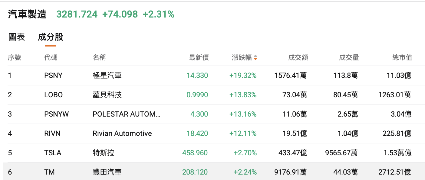 $汽车制造(LIST2054.US)$ 板块上涨, $极星汽车(PSNY.US)$ 涨超 19%, $Rivian Automotive(RIVN.US)$ 涨超 12%, $萝贝科技(LOBO.US)$ 涨超13%,, $特斯拉(TSLA.US)$ 涨超 2%。